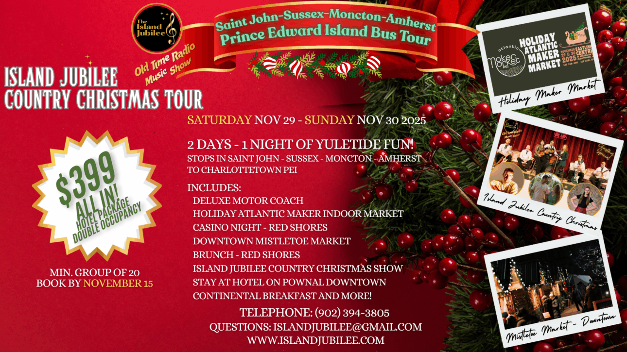 🎶 Saint John-Sussex-Moncton-Amherst-Prince Edward Island Bus Tour – 2 Day-1 Night Stay Saturday-Sunday November 29-30, 2025