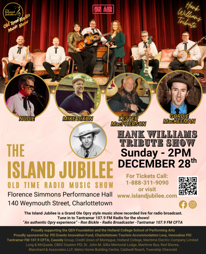 Sun, December 28, 2024 – 2PMIsland Jubilee Old Time Radio Music Show – Hank Williams Tribute Show – Featuring Nudie, Mike Dixon, Lester MacPherson & Gordie MacKeeman (Show Tickets $29.50) Florence Simmons Performance Hall, Charlottetown, Canada Purchase Tickets Here Sun, February 15, 2026 – 2PMIsland Jubilee Old Time Radio Music Show – Valentines Special – (Show Tickets $29.50) Florence Simmons Performance Hall, Charlottetown, CanadaSpecial Guests TBA Purchase Tickets Here Sun, March 15, 2026 – 2PMIsland Jubilee Old Time Radio Music Show – Valentines Special – (Show Tickets $29.50) Florence Simmons Performance Hall, Charlottetown, CanadaSpecial Guests TBA Purchase Tickets Here Sun, April 19, 2026 – 2PMIsland Jubilee Old Time Radio Music Show – Valentines Special – (Show Tickets $29.50) Florence Simmons Performance Hall, Charlottetown, CanadaSpecial Guests TBA Purchase Tickets Here Sponsors